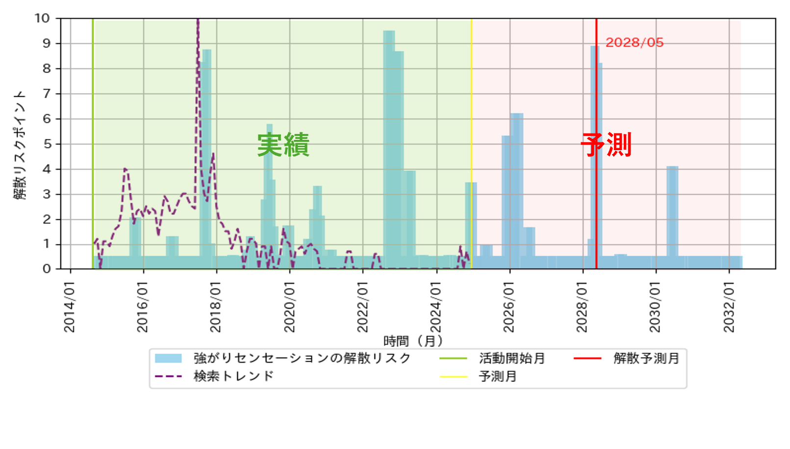 - 解散予測月:最も解散リスクが高まる月を示すライン。